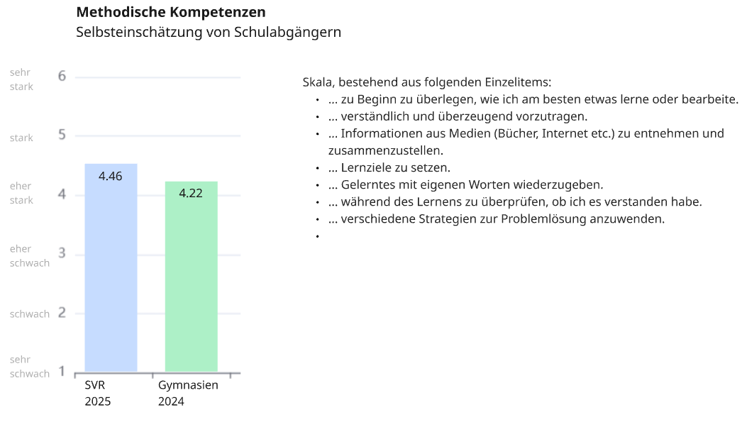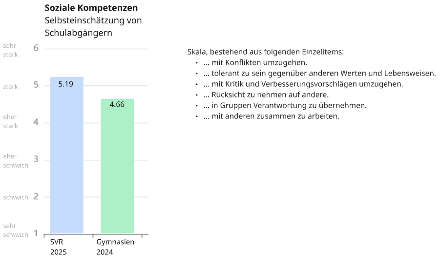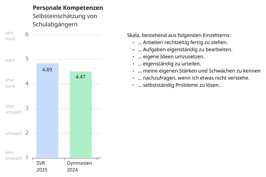 Insbesondere die Ergebnisse bei der Selbsteinschätzung der personalen und sozialen Kompetenzen sind sehr hoch. Dies freut uns sehr, da diese im Berufsleben besonders wichtig sind und auch einen grossen Stellenwert im Lehrplan 21 und im AdL-Schulsystem einnehmen.